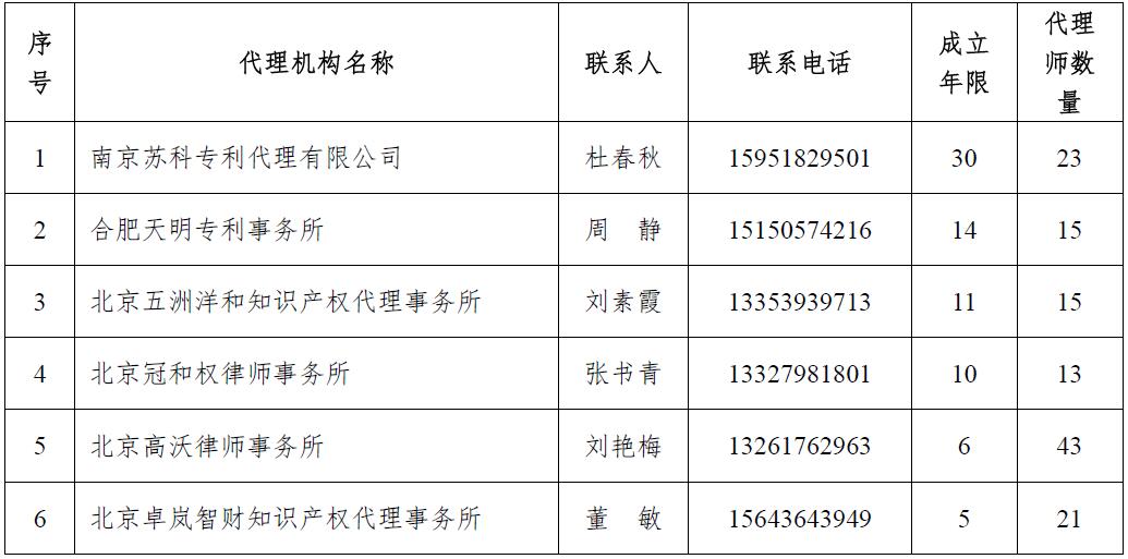 (2)新增专利代理机构:成立年限10年以上(含10年)或专利代理师20人以上(含20人)或代理我校的发明专利实审公开数不少于30件(含30件)。