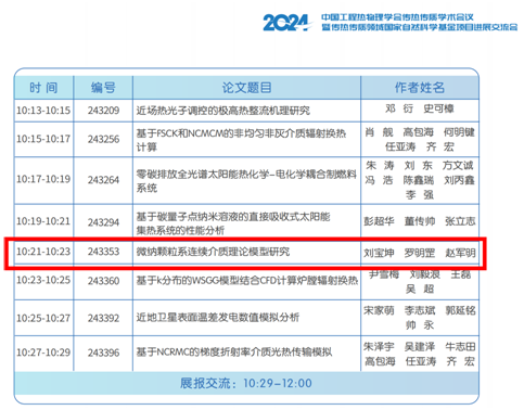 我所学术骨干刘宝坤在辐射换热分会场作了题为《微纳颗粒系连续介质理论模型研究》的口头报告及展板展示,受到良好评价,并对与会专家学者提出的问题进行了讨论与交流,为后续本团队中工程热物理方向上学术研究的深入推进和国家自然科学基金申报书的组织撰写提供了思路和指导。此外,积极与参会的专家学者进行取经交流,为团队基金项目申报、学术合作和成果联合报奖等拓展了渠道。